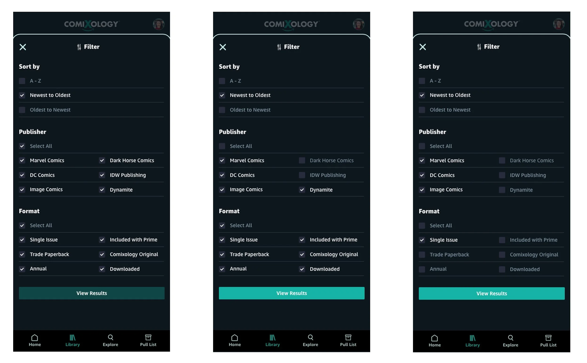 As mentioned earlier, one main problem that I noticed mentioned a lot on Twitter (and by myself!) was that there are currently no filter options in the user library, so I spent a bit of time researching what filters would work best for a library of comic books. My solution incorporated what I felt would be the most useful filter options - sorting order, publishers and book format.