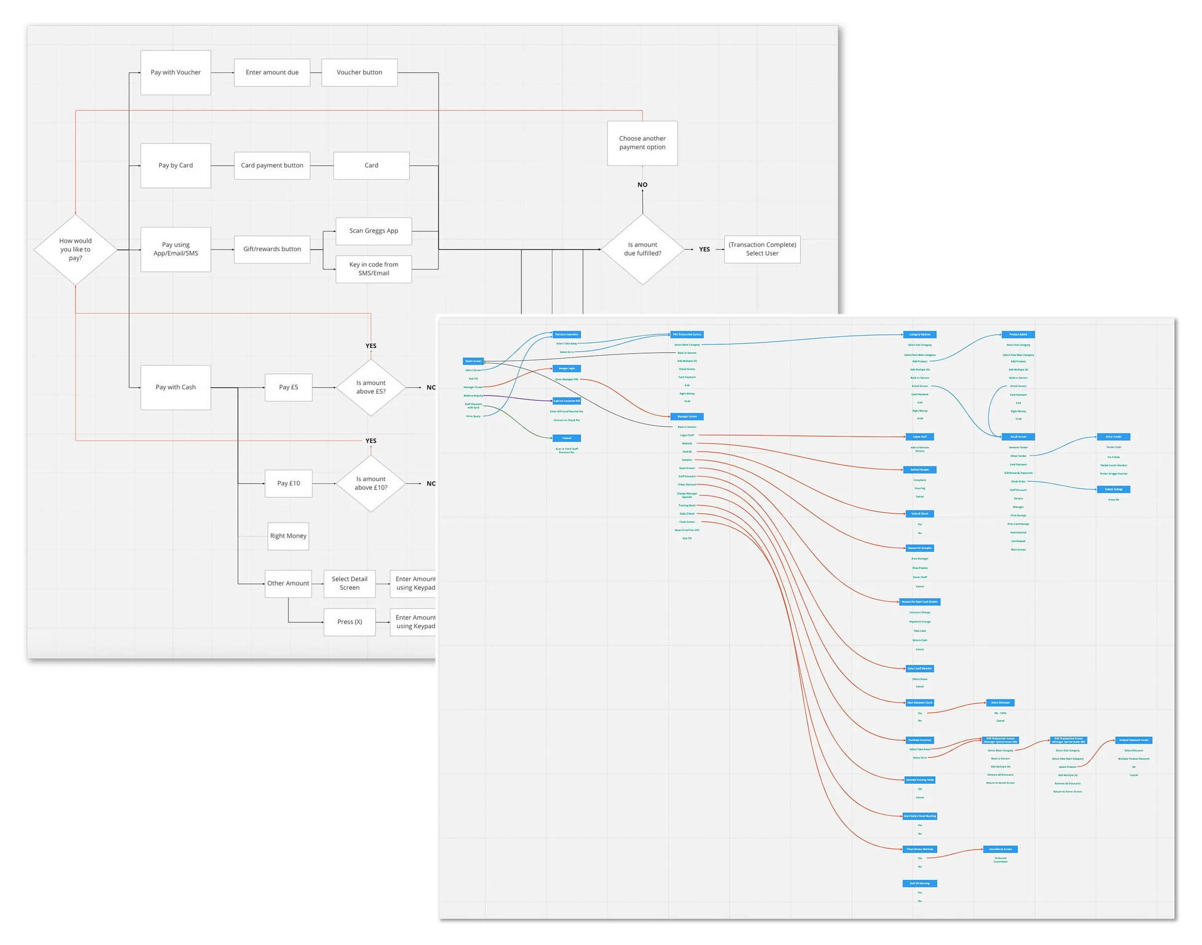 After completing my training, I created a comprehensive site map of the entire till system to solidify my understanding of its structure and functionality. I also mapped out key user flows, including common payment methods such as card, cash, the Greggs app, and vouchers. This process helped me break down each step a colleague takes when serving a customer, highlighting pain points and inefficiencies in the existing experience. By visualising the system in this way, I was able to identify areas of friction and opportunities for improvement.