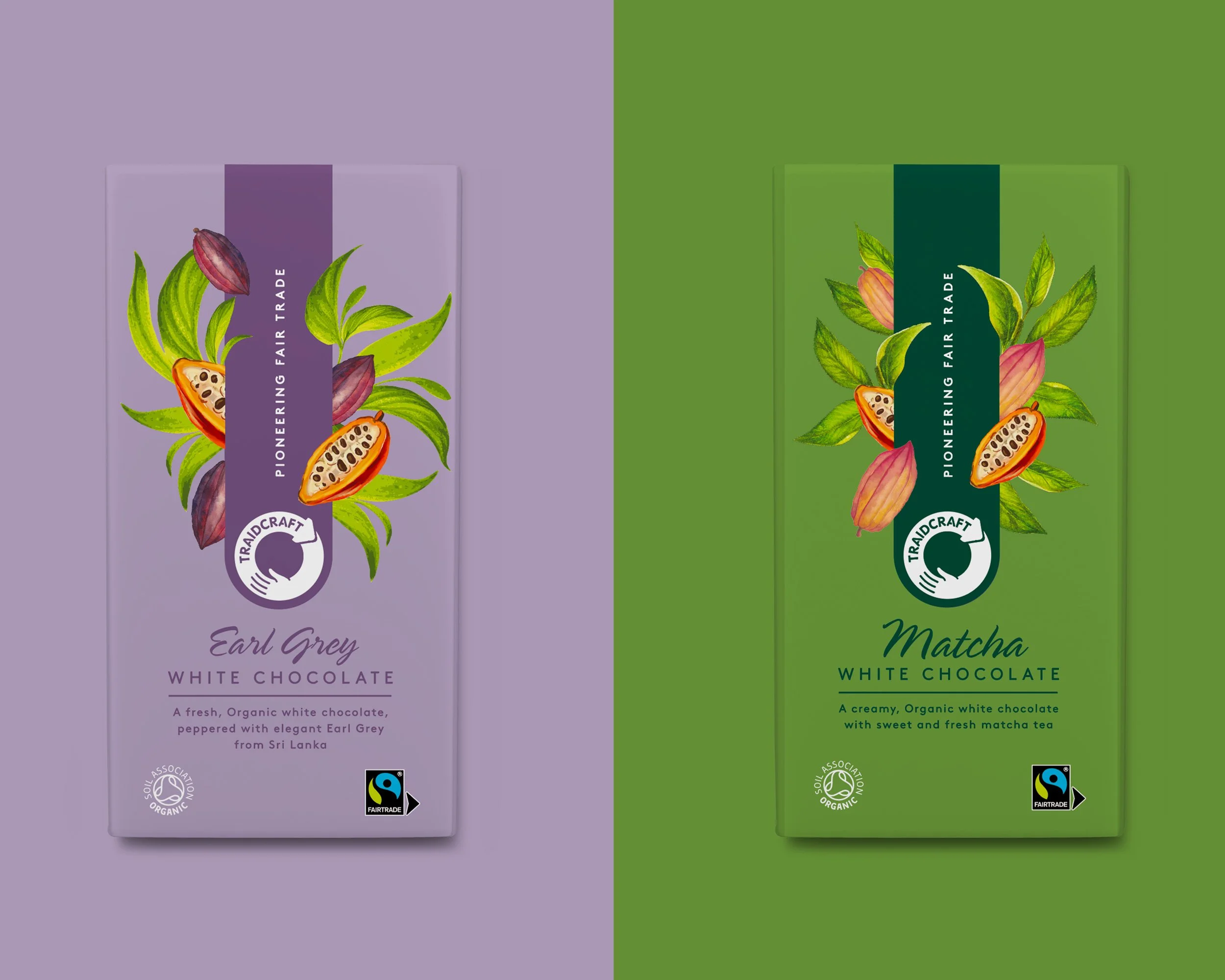 Packaging Designs for Traidcraft Packing created at Traidcraft PLC for a new range of chocolate bars and a special edition tote bag.